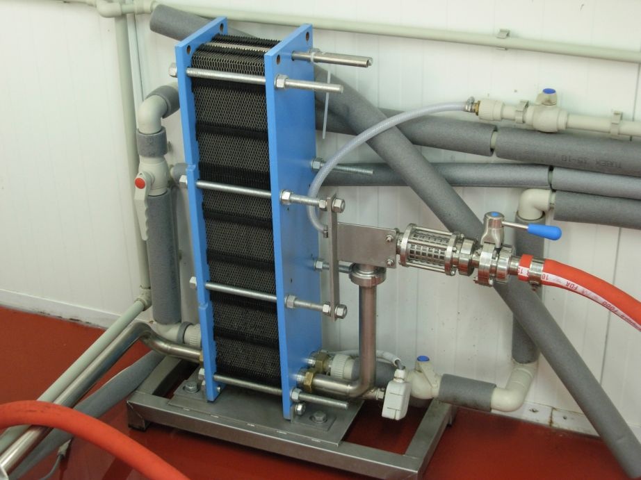 - 1 ks Chladič mladiny, jednostupňový, rozebíratelný deskový výměník na nerezovem podstavci - PRODÁNO