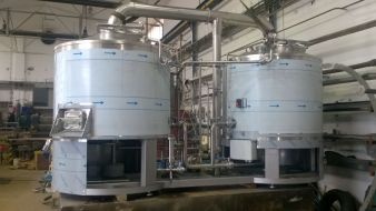 Po úspěšné přejímce konečným odběratelem v naší výrobě je zařízení minipivovaru připraveno k expedici. Na fotografii je dvounádobová varna 10 hl/várku, s nerezovým broušeným opláštěním, umístěná na společném rámu. Odtah brýdových pár je řešen sprchovým kondenzátorem, rmutomladinová pánev je vytápěna speciálními topnými tělesy a zároveň obsahuje funkci vířivé kádě. Pro dopravu je varna opatřena ochrannou fólií. Instalaci minipivovaru si dle projektu naší firmy zajišťuje odběratel, následně bude náš sládek zajišťovat uvedení do provozu a zaškolení obsluhy při zkušebních várkách. Za J.Hradecký s.r.o., Pavel Vaněk